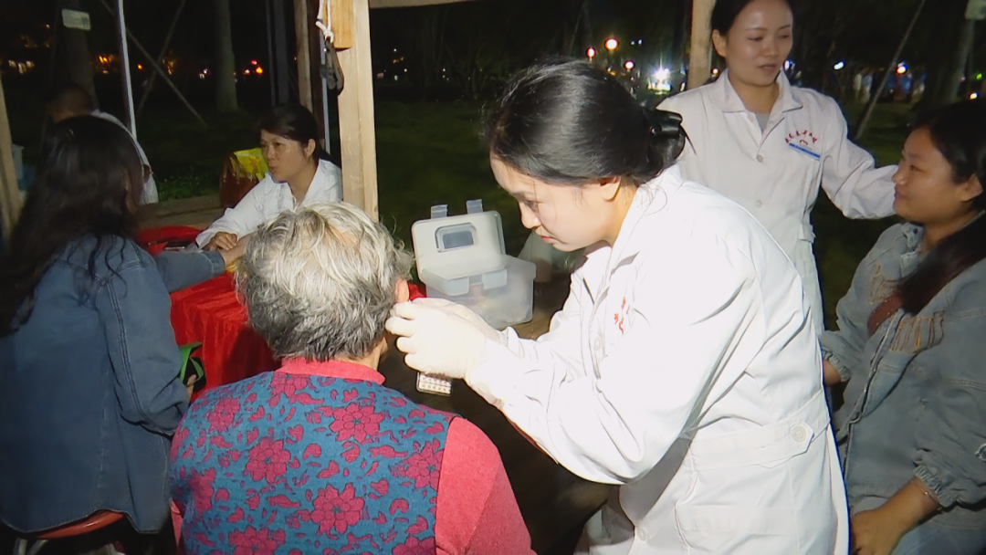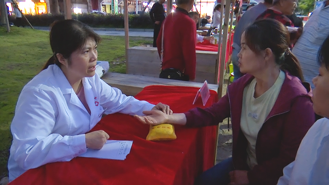傍晚时分,柔远门广场渐渐热闹起来。县中医院与招堤卫生院的医护团队早早搭建好服务摊位,针灸、推拿、中医问诊、中药科普等服务区域有序划分。现场还有中医专家坐诊,免费提供中医脉诊、健康咨询、养生指导、中药茶饮体验等服务,以夜市“摆摊”的形式解答日常健康疑问,普及中医保健知识。