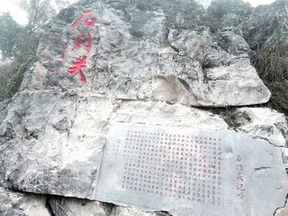 抬眼望去,只见“石门关”三个大字似在云端,在薄雾的笼罩下若隐若现。石刻是近年才刻上去的,下部“石门关记略”似一书卷,清晰可见,记叙了石门关特殊的地理位置、得名原因及历史上的战略地位、大小战事等情况,是人们了解石门关的“第一道门”。