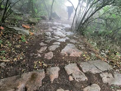 沿路折返,翻过梅子桠口,林木深处,一条两米多宽,石板铺就,光滑圆润,迂回曲折,足有百米的古驿道展现眼前。远远看去,古驿道像一串闪亮的珍珠遗失在山间,一端连着巍巍梅子口,一端伸向茫茫丛林中。据了解,这段古驿道被发现后,请人砍割清理了一下,大约有一百米,前方密林里大概还有两三百米没有被清理出来。