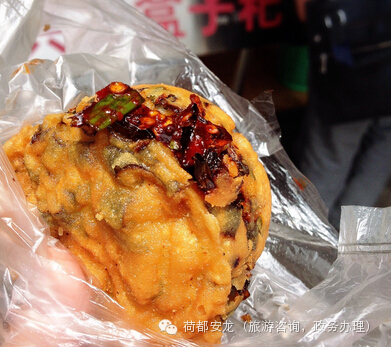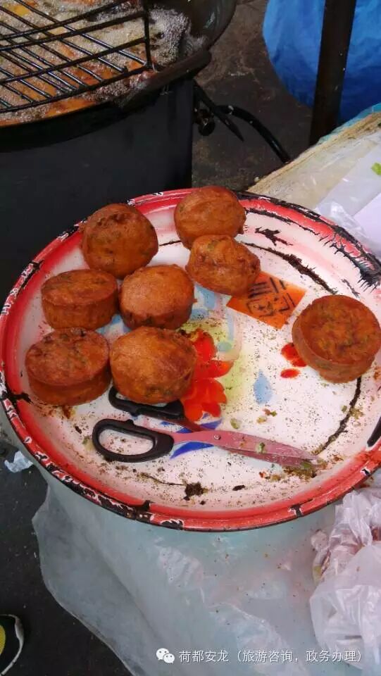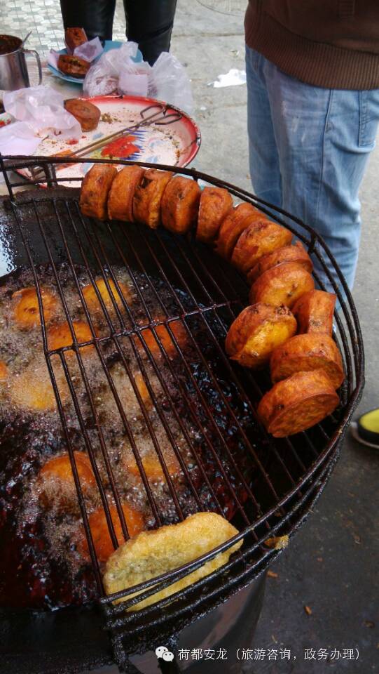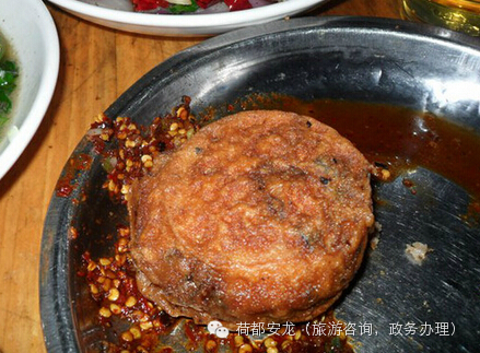 盒子粑:何为盒子粑?这是黔西南州特有一种油炸的面食小吃。在黔西南州的安龙和兴仁尤为知名,特色之处就是用一种铁质的圆形模具成型,在内部加入小葱肉末作为内馅,油炸至金黄色后出锅。根据个人喜好,还可以加入本地特制的辣椒酱!食之有油炸面食的酥香味,有内部葱,肉的香味,还有特制辣酱的辣味。综合在一起是一种非常特别和醇厚的味道。推荐大家品尝!